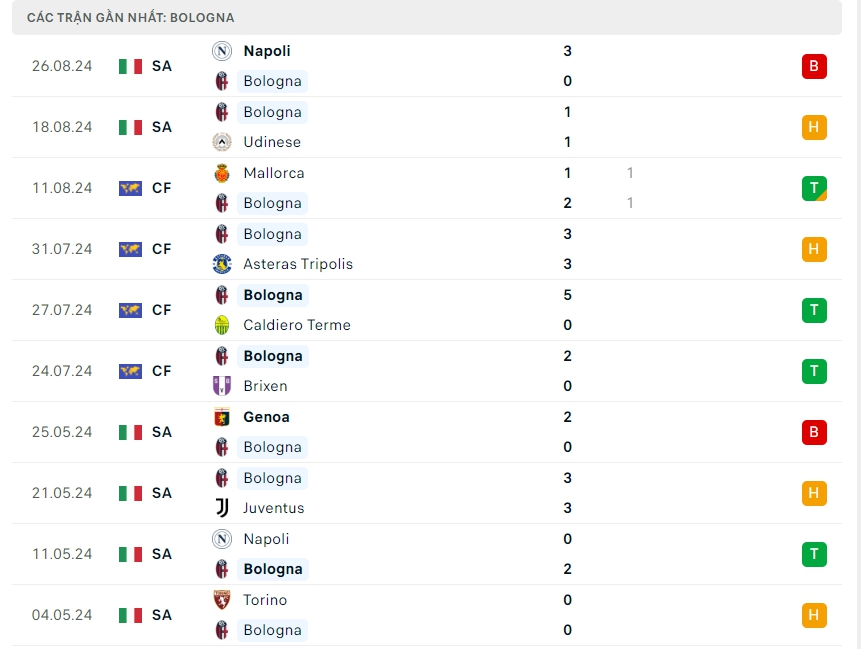 Phong độ đội bóng Bologna vs Empoli