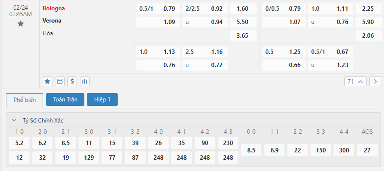 Kèo châu Âu cũng đang là sự ưu thế cho đội chủ nhà khi mức ăn của Bologna đang là 1.60 trong khi đó con số này của Verona đã là 5.50. Nhìn chung việc đang áp đảo trên các phương diện đội hình lẫn phong độ thi đấu sẽ tạo ra một đà tâm lý rất tốt để Bologna hoàn toàn có thể làm chủ được trận đấu sắp tới. Sẽ là một kèo đấu mà Bologna được kì vọng sẽ có thể dễ dàng có được 3 điểm trước Verona và mở ra lợi thế cho mình.