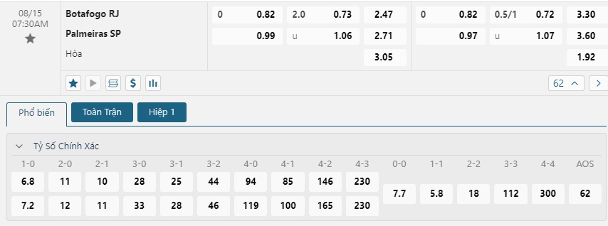 Kèo châu Âu đang là sự cân bằng nhất định đến từ hai đội khi mức ăn của chủ nhà Botafogo đang là 2.47 và đội khách Palmeiras là 2.71, Ưu thế sân nhà cùng phong độ tốt trong những lần đối đầu với Palmeiras và việc Palmeiras đang chơi tệ khi xa nhà là cơ sở để Botafogo hướng đến chiến thắng trong trận đấu này qua đó tạo lợi thế trước đối thủ cho trận lượt về.
