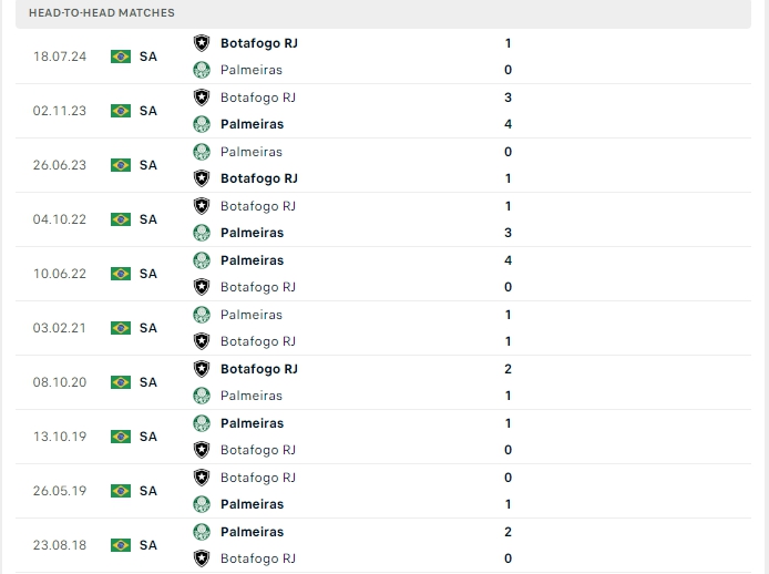 Lịch sử thi đấu của Botafogo vs Palmeiras