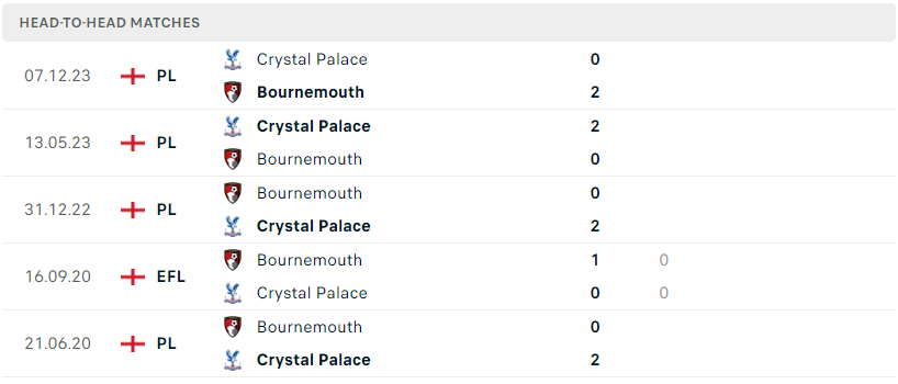 Thành tích đối đầu của Bournemouth vs Crystal Palace