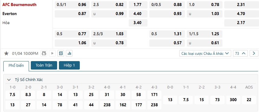 - Chọn Bournemouth -0.75 FT