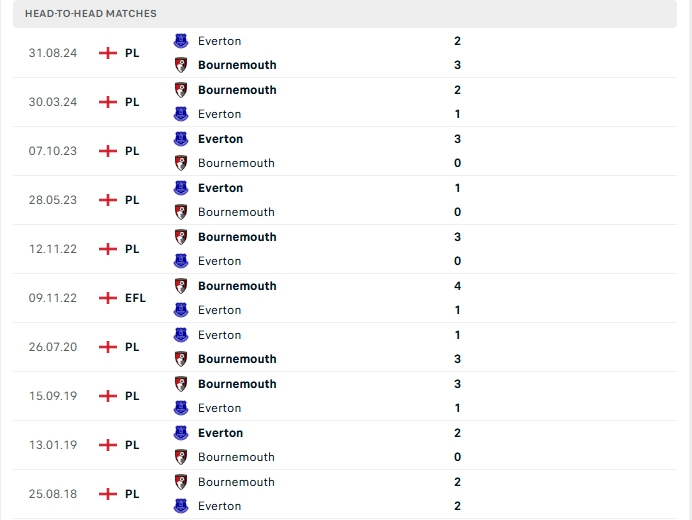 Lịch sử thi đấu của Bournemouth vs Everton