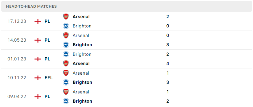 Thành tích đối đầu của Brighton vs Arsenal