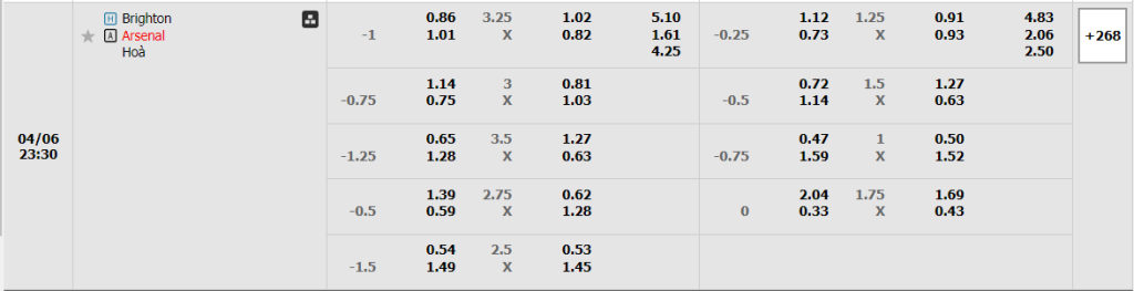Kèo Châu Âu nghiểm nhiên là sự ưu thế dành cho Pháo Thủ thành London, khi mức ăn của họ chỉ là 1.61 và con số này của đội chủ nhà là 5.10. Trong bối cảnh mà phong độ giữa đôi bên đang có quá nhiều sự chênh lệch và Arsenal cũng ra sân với tối đa sự quyết tâm, thì rõ ràng sẽ chẳng có bất kỳ cơ hội nào để Brighton có thể tạo nên bất ngờ, kể cả khi họ được chơi trên sân nhà.