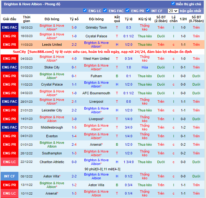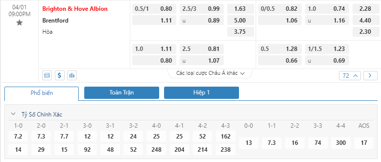 Kèo châu Âu cũng đang là sự ưu thế cho đội chủ nhà khi mức ăn của Brighton đang là 1.63 trong khi đó con số này của Brentford đã là 5.00. Chuỗi những trận đấu thăng hoa đang mang lại một sự tự tin lớn cho Brighton và họ hoàn toàn có thể hướng đến một trận đấu chủ động trước Brentford sắp tới dù cho điều đó là không hề dễ dàng. Nhiều khả năng với các lợi thế cùng bản lĩnh thì Brighton sẽ là đội bóng có được 3 điểm trọn vẹn ở trận đấu tới.