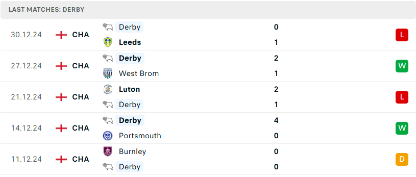 Bên kia, dù vừa để thua tối thiểu trước Leeds, Derby nhìn chung đã có những màn trình diễn đáng khen ngợi trong lần trở lại EFL mùa này. Chỉ sau 24 vòng đấu, đội bóng tân binh đã nhanh chóng bắt nhịp với cường độ của giải đấu. Hiện tại, với khoảng cách 6 điểm so với nhóm cầm đèn đỏ, đoàn quân Paul Warne vẫn chưa phải chịu quá nhiều áp lực từ cuộc chiến trụ hạng. Dẫu vậy, nhiệm vụ cần thiết đối với họ là tiếp tục tích lũy điểm số nhằm duy trì khoảng cách an toàn.