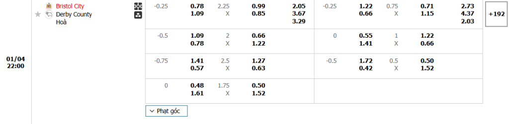 Bảng tỷ lệ kèo bóng đá trận đấu Bristol City vs Derby County