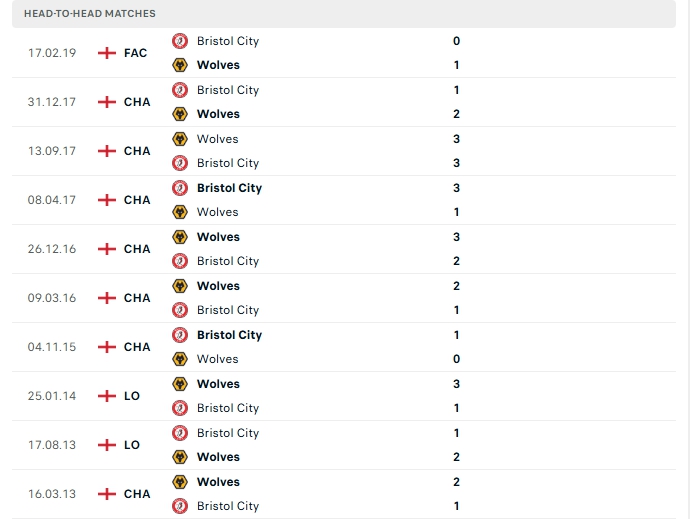 Lần gặp nhau gần nhất trên sân của Bristol City khép lại với chiến thắng tối thiểu 1-0 cho các cầu thủ Wolves, và lần đụng độ này sẻ là cơ hội để Bristol City đòi lại món nợ đó, với tinh thần đang lên cao cùng phong độ tốt thì Bristol City hứa hẹn sẻ tạo nên bất ngờ trước Wolves.