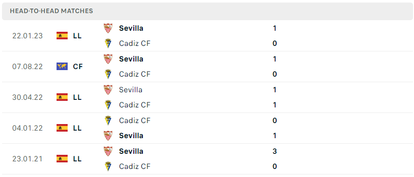 Thành tích đối đầu của Cadiz CF vs Sevilla