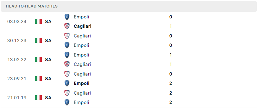 Thành tích đối đầu của Cagliari vs Empoli