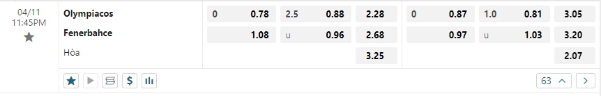 Bảng tỷ lệ kèo bóng đá trận đấu Olympiacos Piraeus vs Fenerbahce