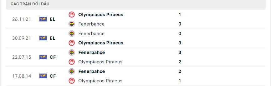 Lịch sử thi đấu của Olympiacos Piraeus vs Fenerbahce