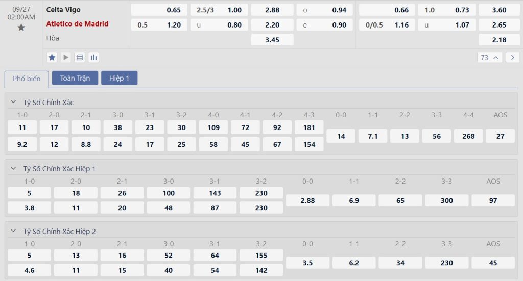 Bảng tỷ lệ kèo bóng đá trận đấu Celta Vigo vs Atletico Madrid
