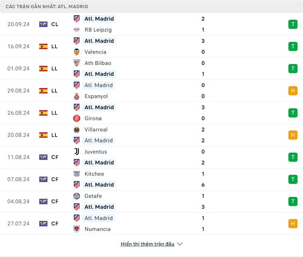 -Phong độ Atletico Madrid