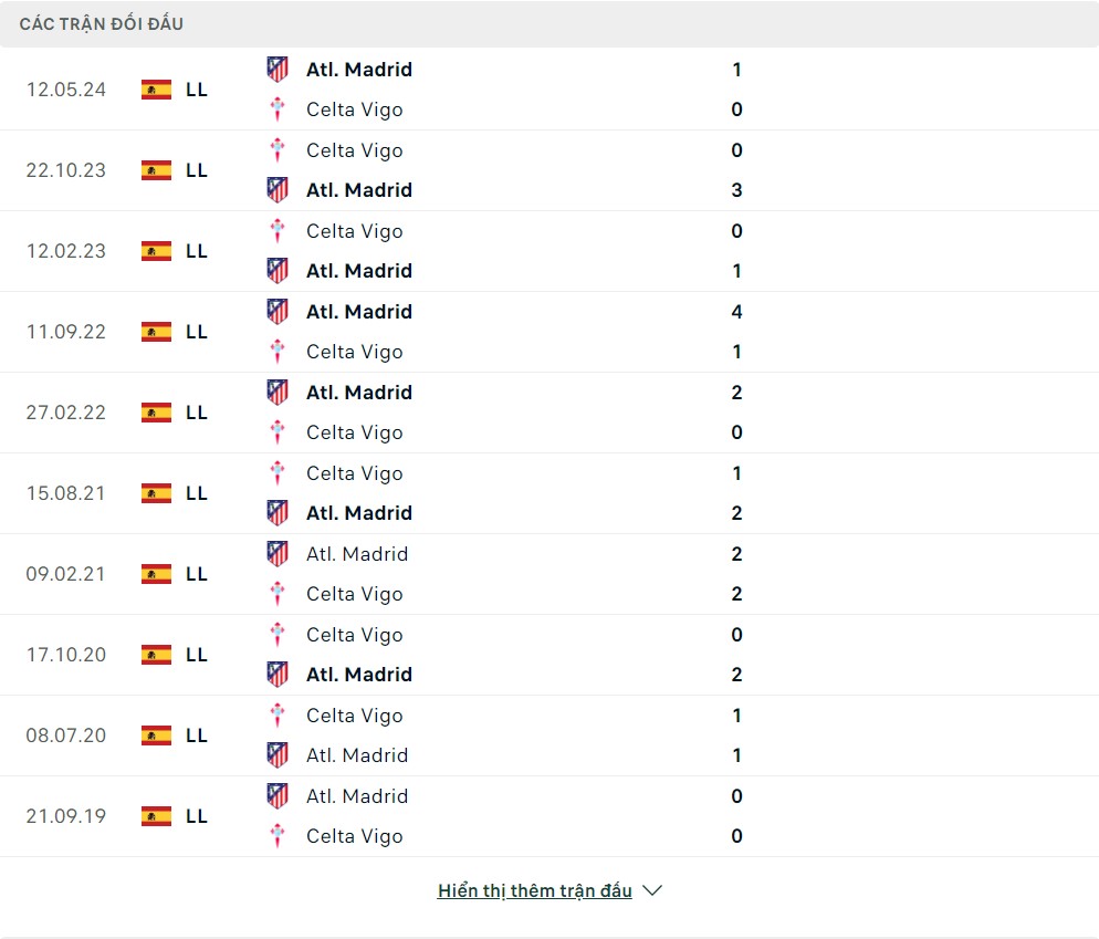 Lịch sử thi đấu của Celta Vigo vs Atletico Madrid