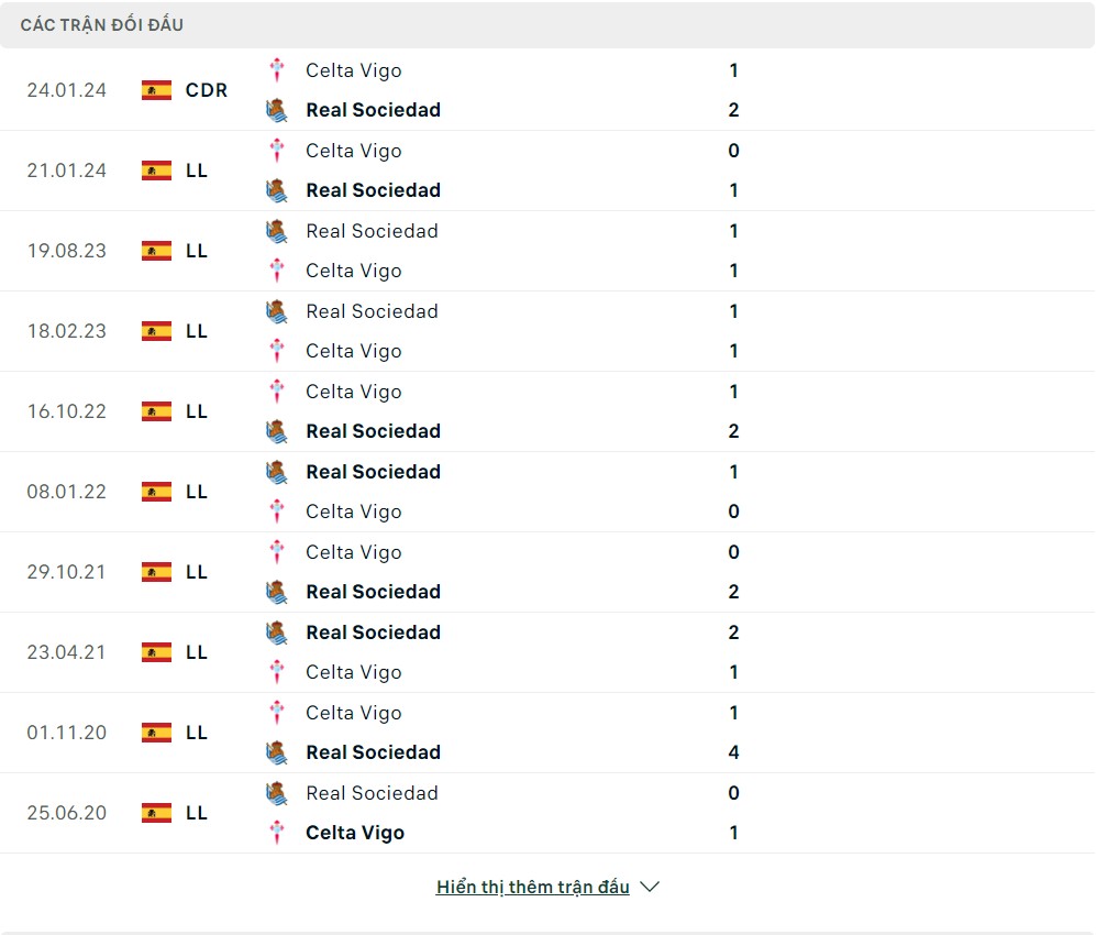 Lịch sử thi đấu của Celta Vigo vs Real Sociedad