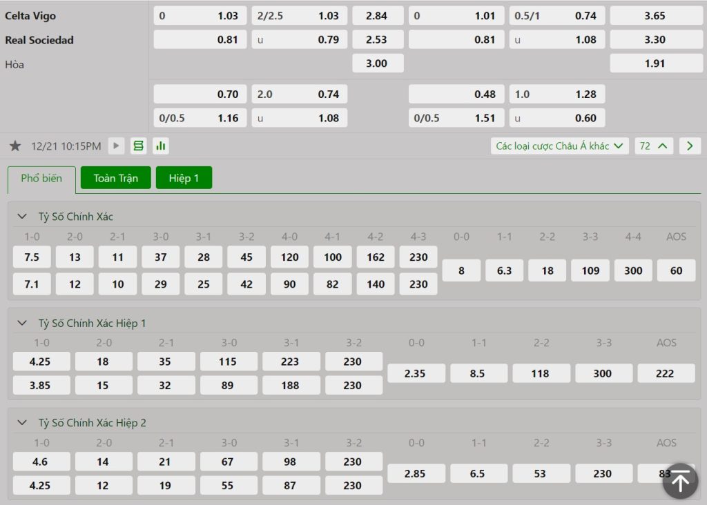 Kèo Châu Âu chứng kiến những con số không quá chênh lệch khi tỷ lệ cho chiến thắng của chủ nhà Celta Vigo là 2.84 trong khi con số này bên phía các vị khách Real Sociedad là 2.53. Khác biệt không đáng kể nhưng bản lĩnh cùng đẳng cấp và quan trọng hơn là sự ổn định của đại diện xứ Basque xứng đáng được đặt niềm tin.