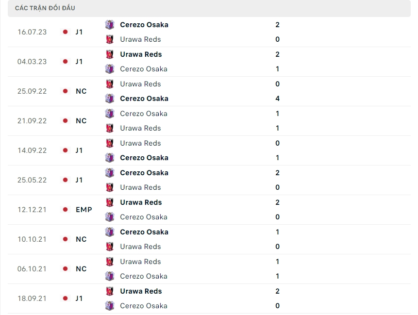 Lịch sử thi đấu của Cerezo Osaka vs Urawa Red Diamonds