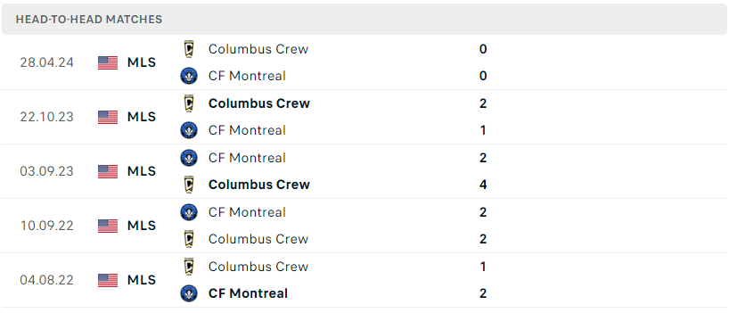 Thành tích đối đầu của CF Montreal vs Columbus Crew