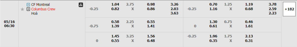 Bảng tỷ lệ kèo bóng đá trận đấu CF Montreal vs Columbus Crew