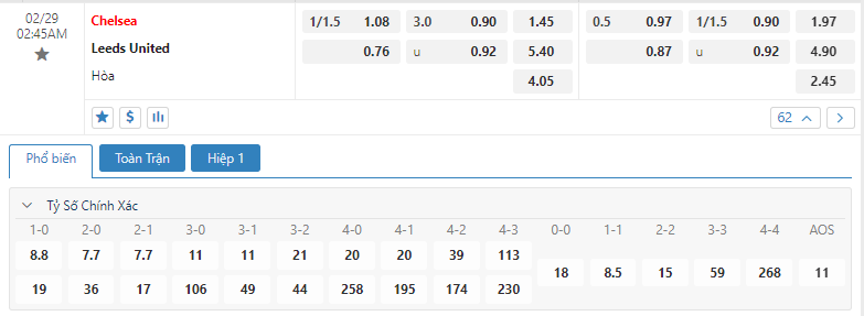 Kèo châu Âu cũng đang là sự ưu thế cho đội chủ nhà khi mức ăn của Chelsea đang là 1.45 trong khi đó con số này của Leeds United đã là 5.40. Chắc chắn đây là một thời điểm mà Chelsea sẽ cần phải thể hiện được bản lĩnh của mình, việc vẫn đang duy trì được một phong độ rất tốt giúp cho họ dường như có thể mở ra các toan tính trước một Leeds United đầy khó chịu và tìm kiếm lợi thế ở trận đấu sắp tới.