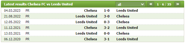 Lịch sử thi đấu của Chelsea vs Leeds United