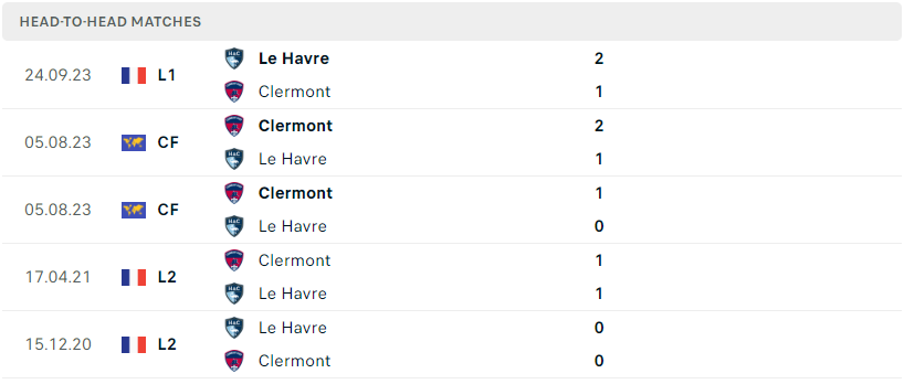 Thành tích đối đầu của Clermont vs Le Havre