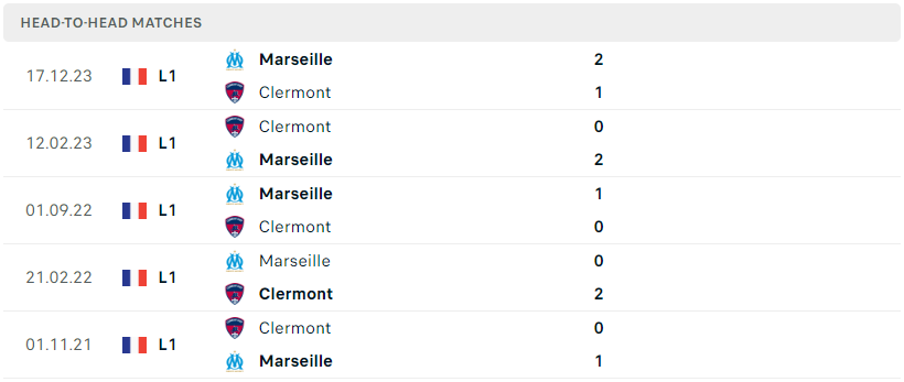 Thành tích đối đầu của Clermont vs Marseille