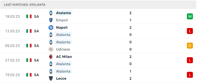 Trong khi đó, Atalanta đang cho thấy rất rõ những sự sa sút của mình, bằng chứng là việc đoàn quân của HLV Gian Piero Gasperini đã trải qua đến 4 vòng đấu liên tiếp tại Serie A không biết đến mùi chiến thắng trước khi đánh bại Empoli đang suy yếu ở vòng đấu trước. Dẫu vậy cần nhìn nhận một cách thực tế rằng, Atalanta vẫn luôn sở hữu một lối chơi hết sức khó chịu và cùng với đó là dàn nhân sự vô cùng đồng đều. Mặc cho thành tích thi đấu của vị khách trong những vòng đấu trở lại đây là vô cùng thất vọng nhưng với đẳng cấp và thực lực vốn có thì họ hoàn toàn có thể tự tin vào một kết quả tốt trong trận chiến sắp tới.