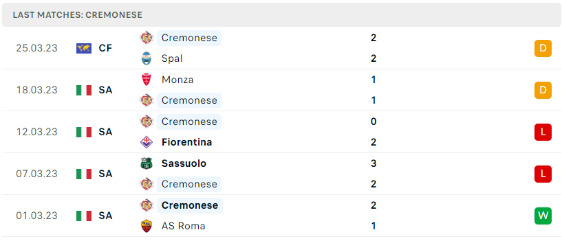 Với trận hòa vô cùng thất vọng trước Monza ở vòng đấu thứ 27 tại Serie A thì tân binh Cremonese đã trực tiếp nâng số trận không biết đến mùi chiến thắng của mình lên con số 3. Những chấn thương của hoàn loạt trụ cột là lý do lớn khiến Cremonese sa sút không phanh ở mùa giải năm nay, bên cạnh đó sự non nớt và thiếu kinh nghiệm của các cầu thủ trẻ cũng là một trong những nguyên nhân. Một hệ thống thiếu gắng kết và rời rạc thì thật khó để đoàn quân của HLV Davide Ballardini có thể tạo ra được quá nhiều sự khác biệt. Cuộc tiếp đón Atalanta ở vòng đấu thứ 28 sắp tới sẽ là một thử thách khó khăn nữa dành cho họ.
