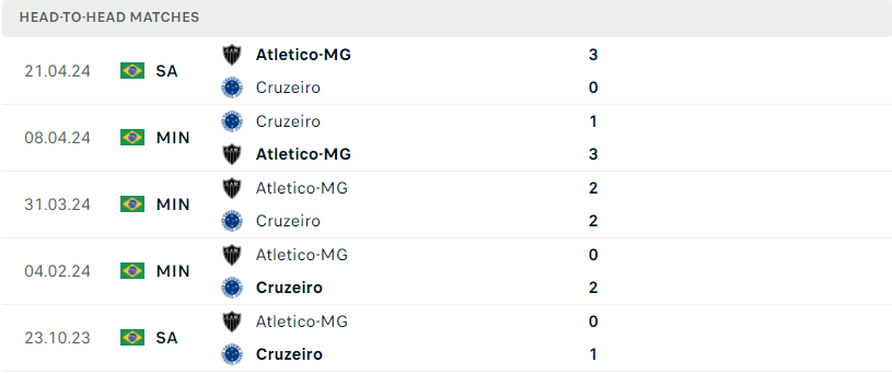 Thành tích đối đầu của Cruzeiro vs Atl. Mineiro