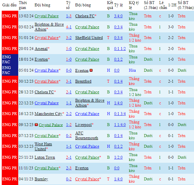 Kèo châu Âu cũng đang là sự ưu thế cho đội chủ nhà khi mức ăn của Crystal Palace đang là 1.97 trong khi đó con số này của Burnley đã là 3.65. Một khoảng thời gian vô cùng khó khăn và hơn lúc nào hết Crystal Palace sẽ cần phải có được sự quyết tâm vươn lên cùng với đó là những giải pháp để đưa mình trở lại với guồng quay hiện tại. Các lợi thế đang có sẽ là cơ sở để họ có thể nghĩ đến một chiến thắng trước Burnley ở trận đấu tới.
