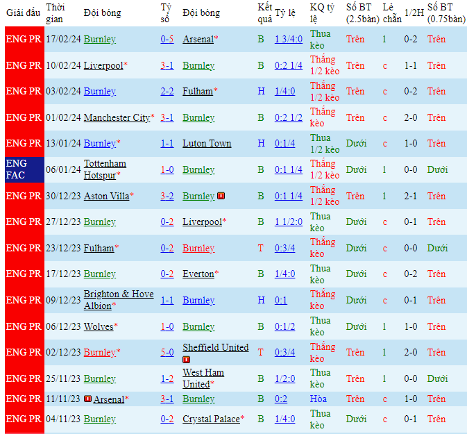 Trong khi đó với Burnley, có lẽ mọi thứ đối với binh đoàn tân binh này cũng chẳng có mấy khác biệt khi mà họ vừa để cho Arsenal vùi dập với tỉ số 5-0 đầy nhạt nhòa. Trận thua thứ 18 của các vị khách chỉ sau 25 vòng đấu đã chơi ở mùa giải năm nay và không có gì quá bất ngờ khi mà họ đang phải chôn chân ở vị trí áp chót trên BXH với chỉ vỏn vẹn 13 điểm có được. Thời gian đang dần rất ngắn đối với Burnley và ngay cả khi hành quân đến sân của Crystal Palace sắp tới thì đó vẫn là thách thức với họ. Màn so tài sẽ là sự chủ động đến từ đội chủ nhà, tuy nhiên khả năng sẽ không có quá nhiều bàn thắng xuất hiện.