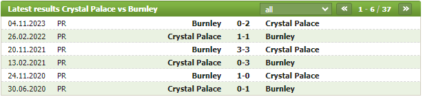 Lịch sử thi đấu của Crystal Palace vs Burnley