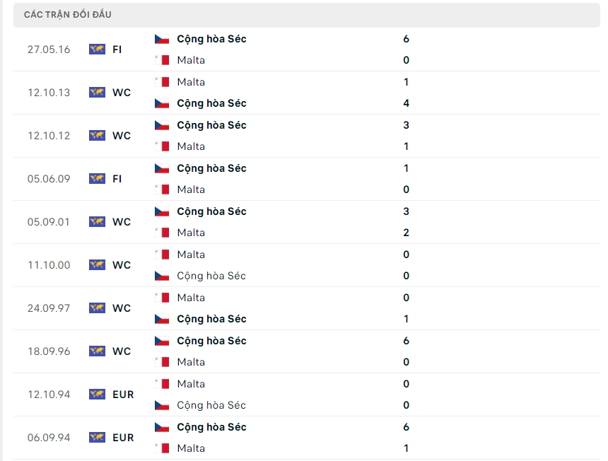 Lịch sử thi đấu của Czech vs Malta
