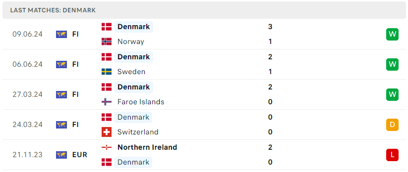 Màn trình diễn của đội tuyển Đan Mạch trong giai đoạn giao hữu tiền giải đấu là khá ấn tượng khi họ đã mang về đến 3 chiến thắng và 1 trận hòa sau 4 trận đấu. Tại vòng loại, “những chú lính chì” cũng chơi cực hay khi đồng sở hữu vị trí đầu bảng với Slovenia. Lần trở lại giải đấu lớn sau 2 năm kể từ sau World Cup 2022 của Đan Mạch là rất hứa hẹn khi không chỉ sở hữu nhiều ngôi sao, lối chơi của họ cũng đã trở nên trơn tru hơn. Chạm mặt đội tuyển Anh ở lượt đấu thứ 2 được xem là bài test lớn nhất cho họ.