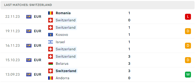 Bên kia, với một bảng đấu không có sự góp mặt của bất kỳ ông lớn nào giúp cho Thụy Sĩ giành vé tham dự VCK Euro 2024 mà không phải thông qua vòng play-off. Dù vậy, nhưng thứ mà đoàn quân Murat Yakin cần phải cải thiện ngay lập tức chính là phong độ, trận thua trước Romania vừa qua rõ ràng là một báo động đỏ khi mà họ đã không thắng trong 4 trận đấu kể từ từ tháng 10 năm ngoái. Nếu muốn tiến sau tại Euro sắp tới họ buộc phải sớm tìm lại sự lì lợm quen thuộc.