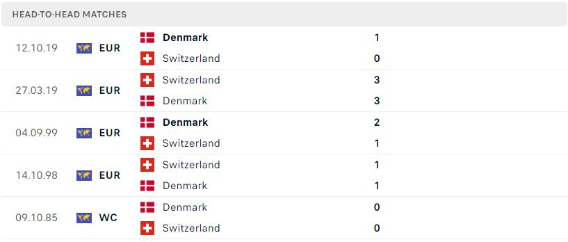 Thành tích đối đầu của Đan Mạch vs Thụy Sĩ