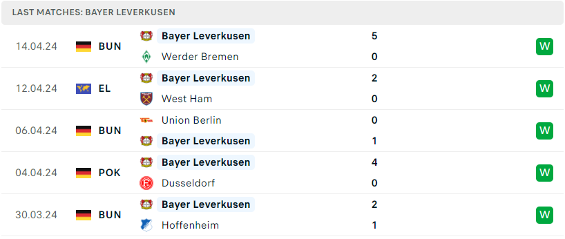 Phía kia, Bayer Leverkusen không còn là “hiện tượng” của bóng đá Châu Âu, khi giờ đây đoàn quân Xabi Alonso đã trở thành nhà tân vương của Bundesliga và hơn cả là ngắt ách thống trị của Hùm Xám. Tính đến hiện tại, tổng cộng Die Werkself đang bất bại đến 42 trận đấu trên mọi đấu trường(thắng 37, hòa 5, ghi đến 121 bàn thắng), một kỷ lục của bóng đá Đức. Bên cạnh đó, họ còn đứng trở cơ hội trở thành nhà vô địch với thành tích bất bại. Tuy nhiên, điều kiện cần là họ buộc phải vượt qua Dortmund.