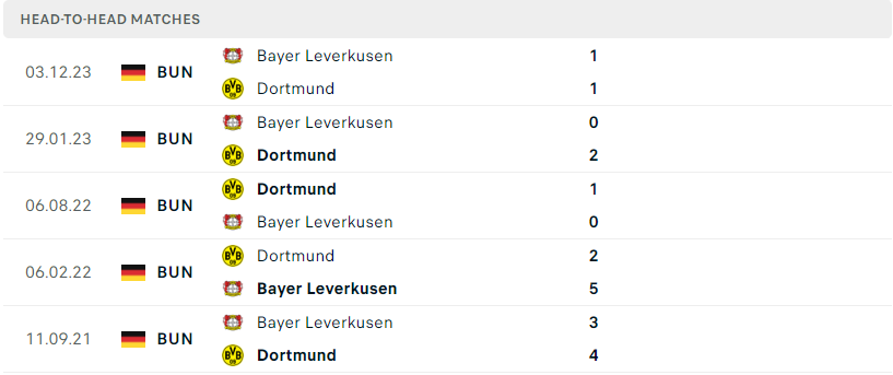 Thành tích đối đầu của Dortmund vs Bayer Leverkusen