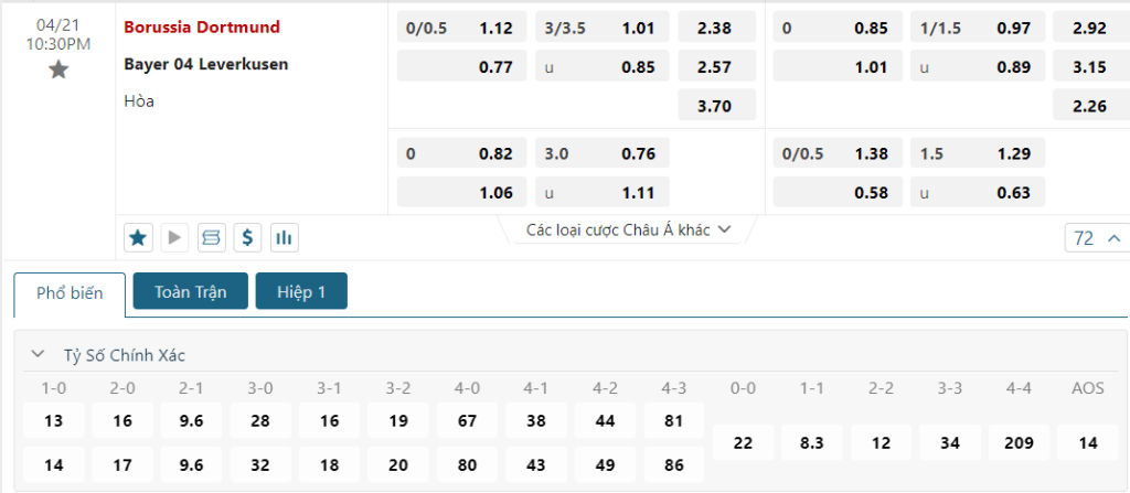 Bảng tỷ lệ kèo bóng đá trận đấu Dortmund vs Bayer Leverkusen