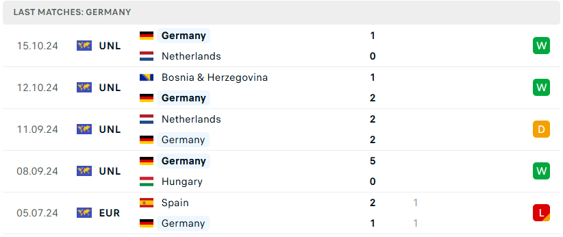 Dưới sự dẫn dắt của HLV tài năng Julian Nagelsmann, tuyển Đức đang dần tìm lại quỹ đạo của mình. Mặc dù không thể tiến vào trận chung kết Euro vừa qua, nhưng quả thật họ đã có một kỳ Euro đầy ấn tượng trên sân nhà, để lại dấu ấn mạnh mẽ với lối chơi gắn kết và nhiệt huyết. Đáng chú ý, phong độ tại Nations League cũng rất ổn định khi tuyển Đức giành được 3 chiến thắng và chỉ hòa 1 trong 4 trận gần nhất. Thành tích này phần nào phản ánh quyết tâm và sự tập trung của ‘Cỗ xe tăng’ ở hiện tại.