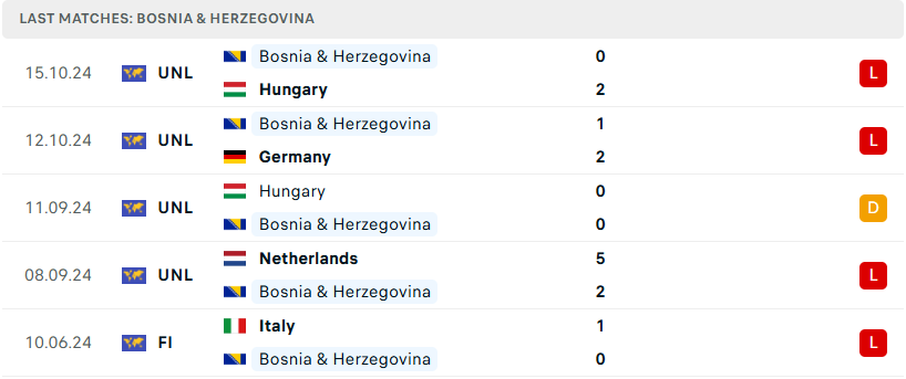 Bên phía kia, là đội bóng yếu nhất bảng đấu Bosnia & Herzegovina nhanh chóng thể hiện sự chênh lệch khi chỉ giành được đúng 1 trận hòa trước Hungary sau 4 lượt trận. Rơi vào League A quả thật là một thách thức lớn nhưng đồng thời cũng là cơ hội quý báu để Bosnia & Herzegovina học hỏi và tích lũy kinh nghiệm thi đấu đỉnh cao. Tuy nhiên, trước một tuyển Đức đầy thăng hoa trên sân nhà, họ sẽ phải chuẩn bị sẵn sàng cho một chuyến đi hứa hẹn nhiều gian nan.