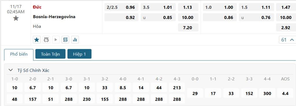 Kèo Châu Âu tiếp tục là sự áp đảo hoàn toàn dành cho tuyển Đức, khi mức ăn của họ là 1.13 và con số này của các vị khách là 10.00. Với lợi thế sân nhà và đội hình vượt trội, khả năng Đức giành chiến thắng gần như là điều chắc chắn. Tinh thần quyết tâm cao cùng ưu thế về mặt lực lượng và lối chơi đang vào ‘form’, Đức hứa hẹn sẽ kiểm soát thế trận và có được chiến thắng thuyết phục.