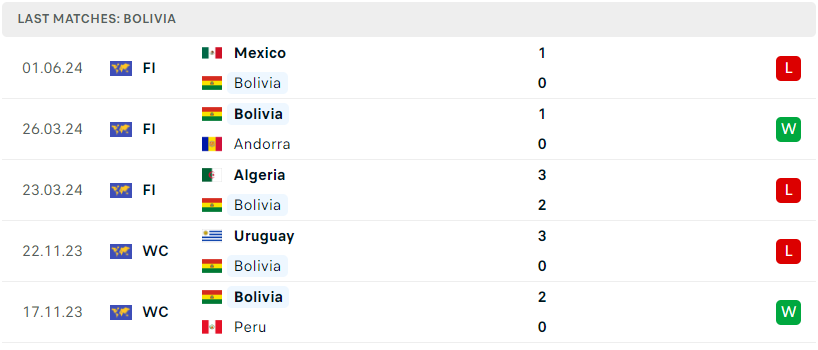 Bên phía đối diện, Bolivia lại chẳng thể hiện được bất cứ điều gì, không những thi đấu yếu kém tại vòng loại World Cup 2026, La Verde còn thi đấu đầy cập rập tại các trận đấu không chính thức như giao hữu. Thất bại trước Mexico đầu tháng 6 vừa qua thực tế đã là thất bại thứ 8 thầy trò Carlos Zago ở 10 lần ra sân gần nhất. Một lối chơi tương đối yếu kém cộng kèm với dàn nhân sự thiếu chất lượng rõ ràng những rào cản lớn của Bolivia để họ có thể bứt phá nền bóng đá vốn đã lụi tàn.