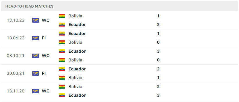 Thành tích đối đầu của Ecuador vs Bolivia
