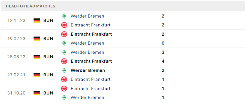 Thành tích đối đầu của Eintracht Frankfurt vs Werder Bremen