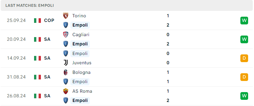 Sự thành công của Empoli sau 5 vòng đấu đầu mùa không thể không kể đến lối chơi thực dụng và đầy tính kỷ luật của họ, binh đoàn Roberto D’Aversa chỉ mới nhận về vỏn vẹn 2 bàn thua, thậm chí trên sân nhà họ cũng chưa để lọt lưới. Chính vì lẽ đó, khả năng nổ tài trong trận đấu sắp tới là không quá khả thi.