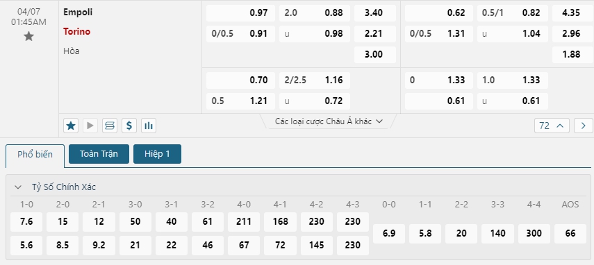 Soi kèo chấp 7M Empoli vs Torino